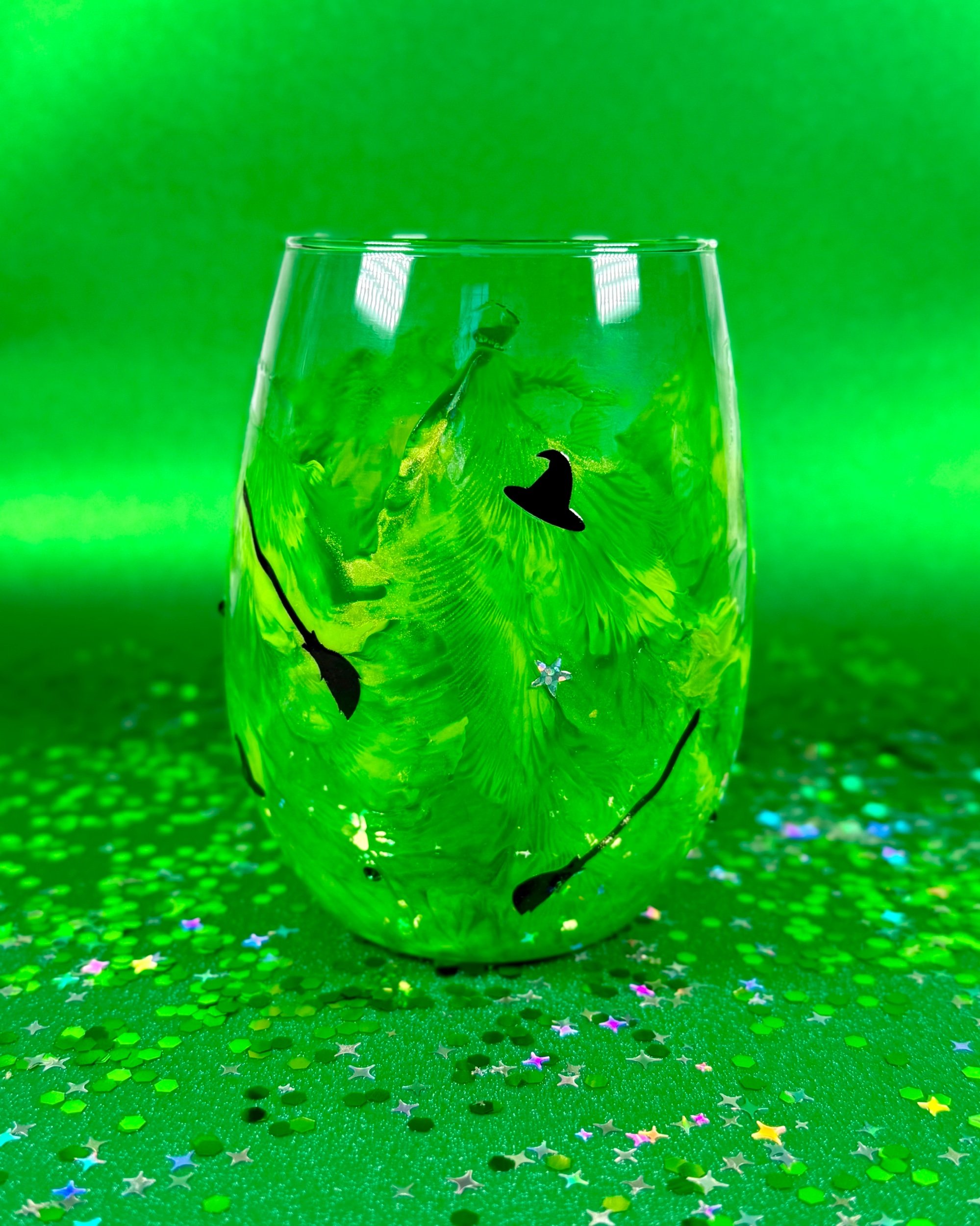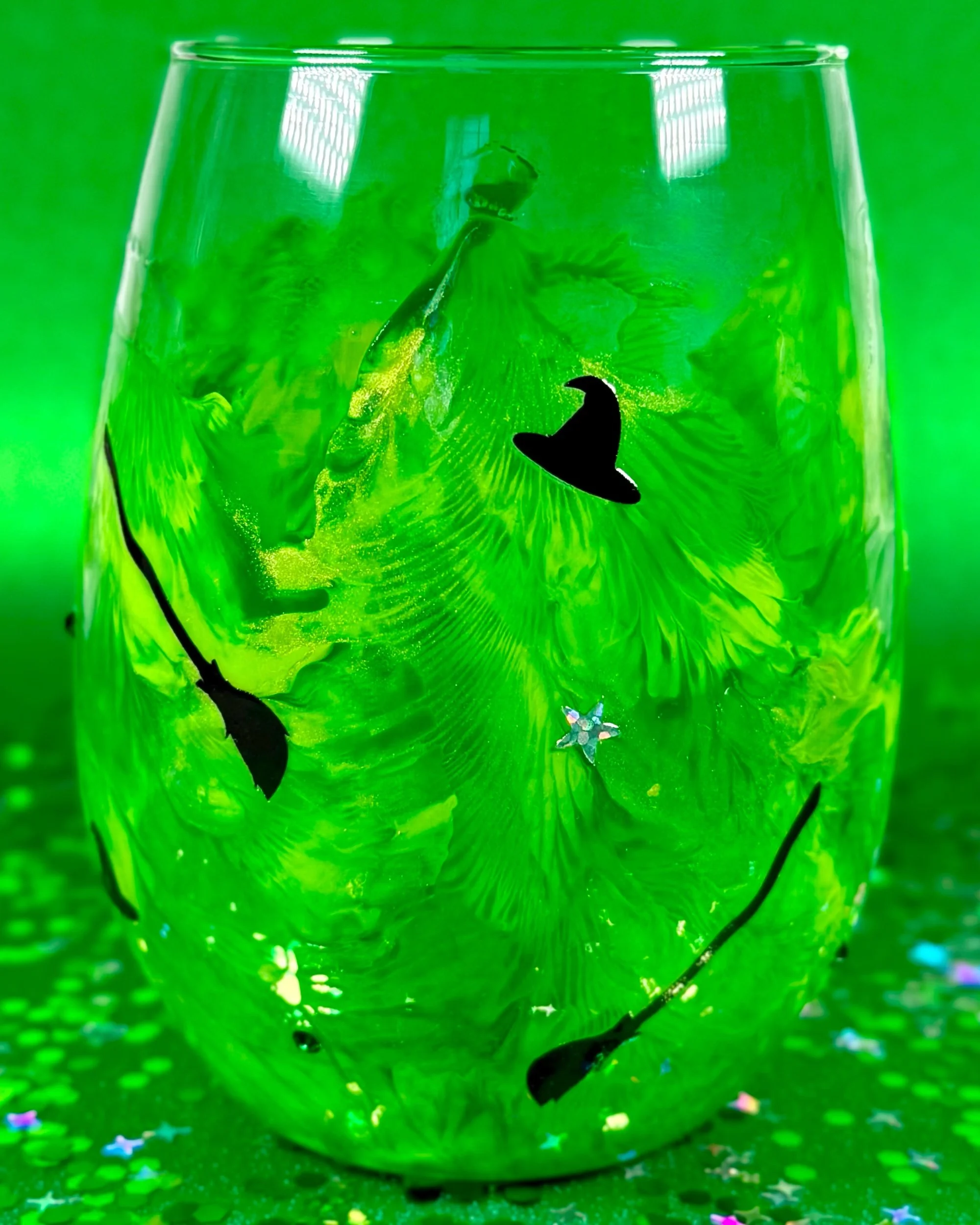 Each glass is hand-painted in a mix of electric and metallic green and adorned with black broomstick and witch hat accents.